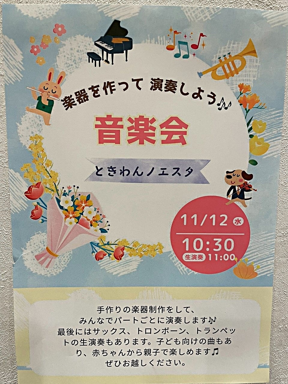 最後にはサックス、トロンボーン、トランペットの生演奏もあります。子ども向けの曲もあり、赤ちゃんから親子で楽しめます🎵ぜひお越しください。