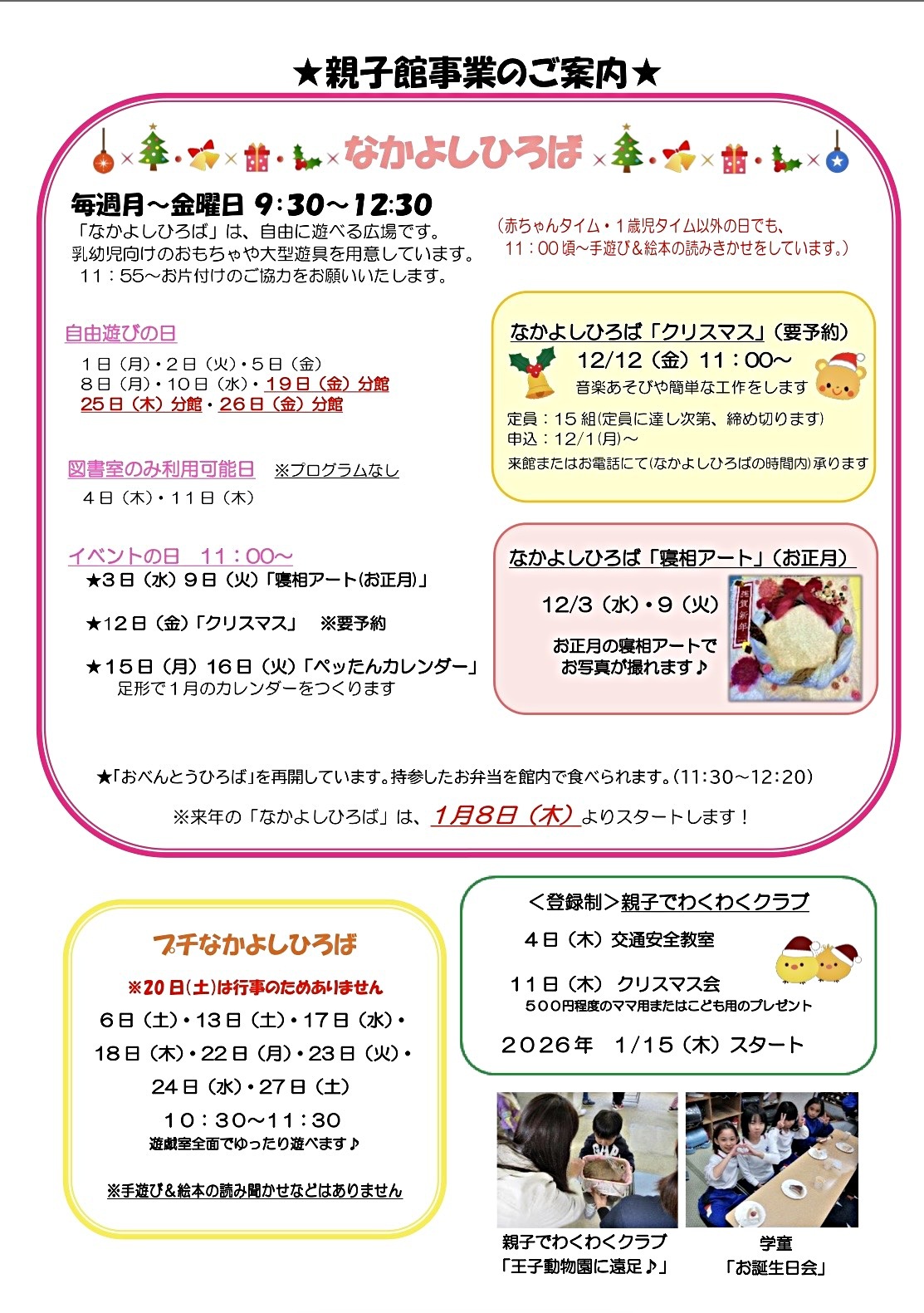 12日クリスマス会は先着15名予約制です。20日は行事のため、プチなかよしひろばの実施はありません。その他分館での実施、冬休み等変動があるためじどうかんだよりをご確認の上ご来館ください。