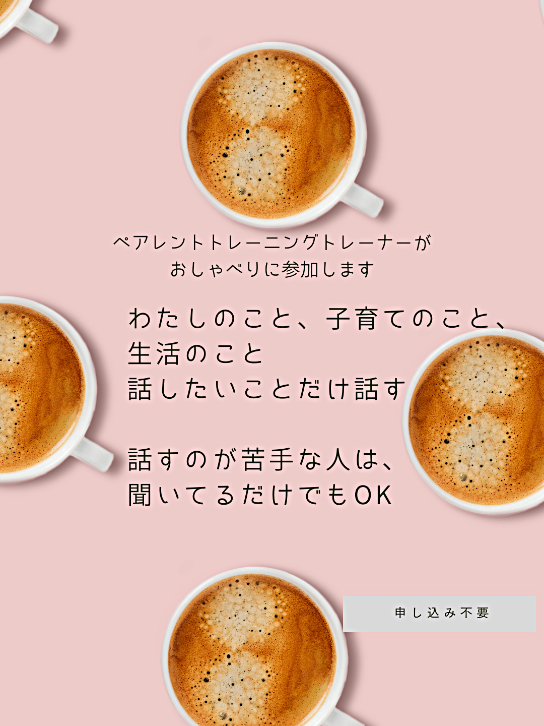 ペアレントトレーニングトレーナーがおしゃべりに参加し、ご自身の話、子育ての話、生活の話など、話したいことだけ話せます。