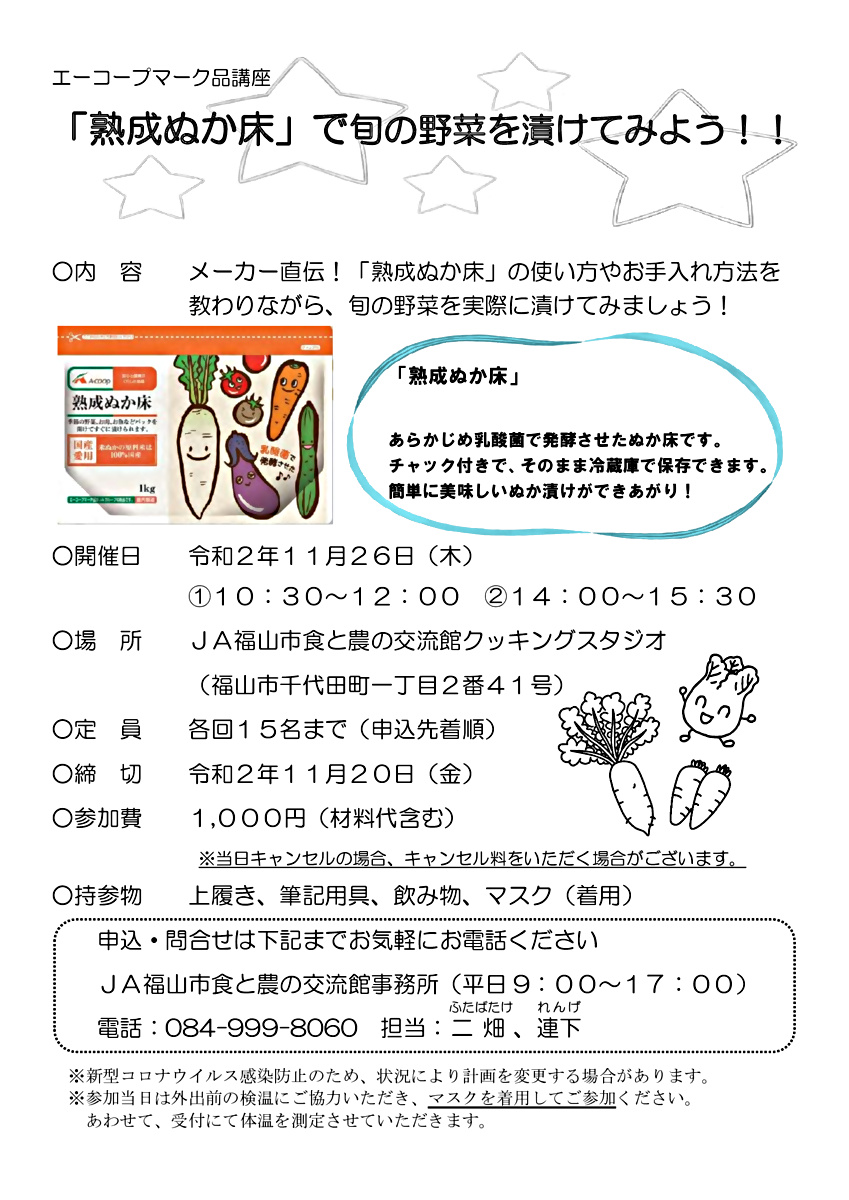 エーコープマーク品講座 「熟成ぬか床」で旬の野菜を漬けてみよう!!