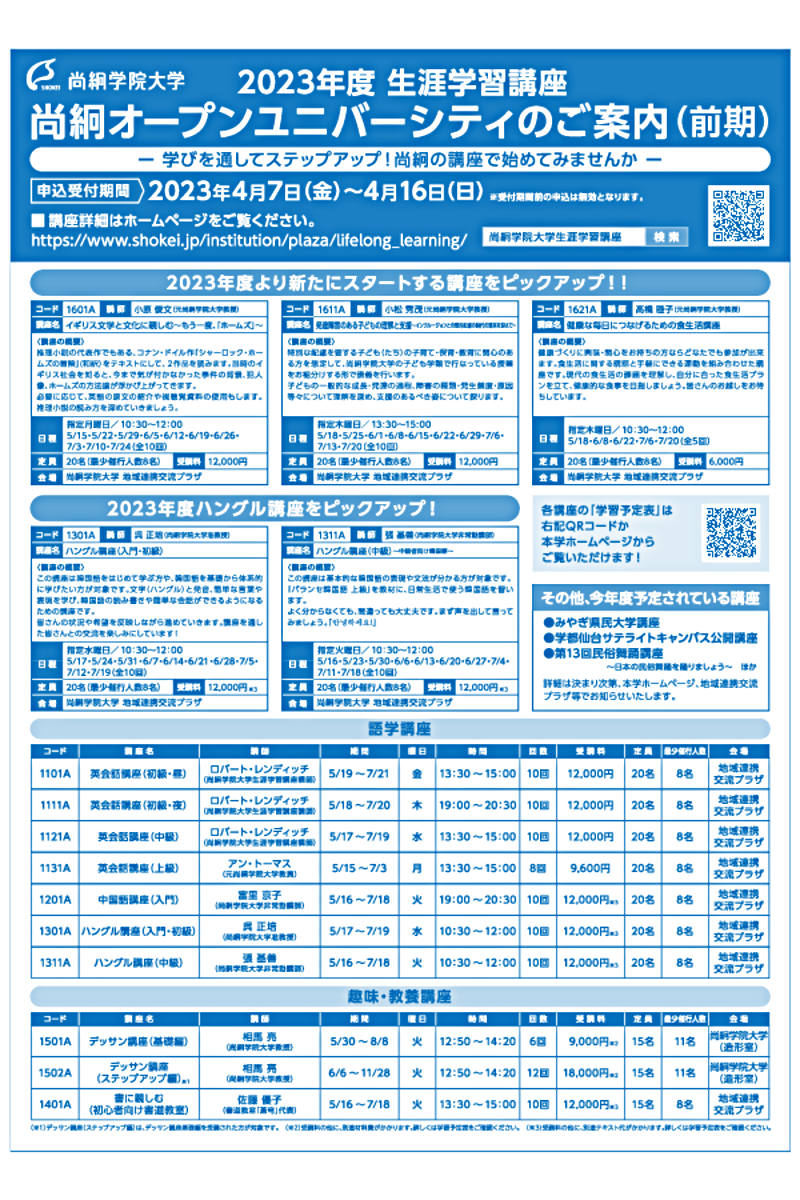 尚絅学院大学生涯学習講座2023年度前期の申込受付が4月7日(金)より開始されました。