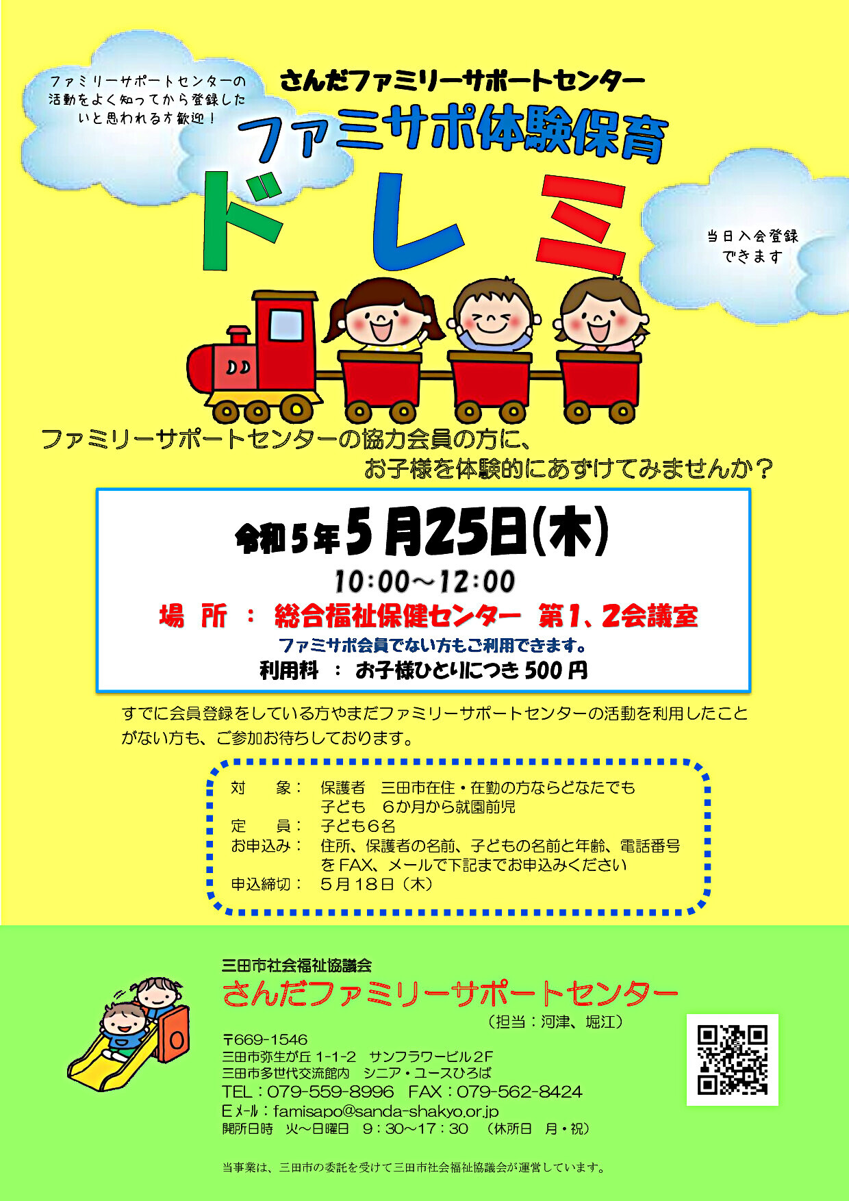 さんだファミリーサポートセンターが体験保育ドレミを開催します。