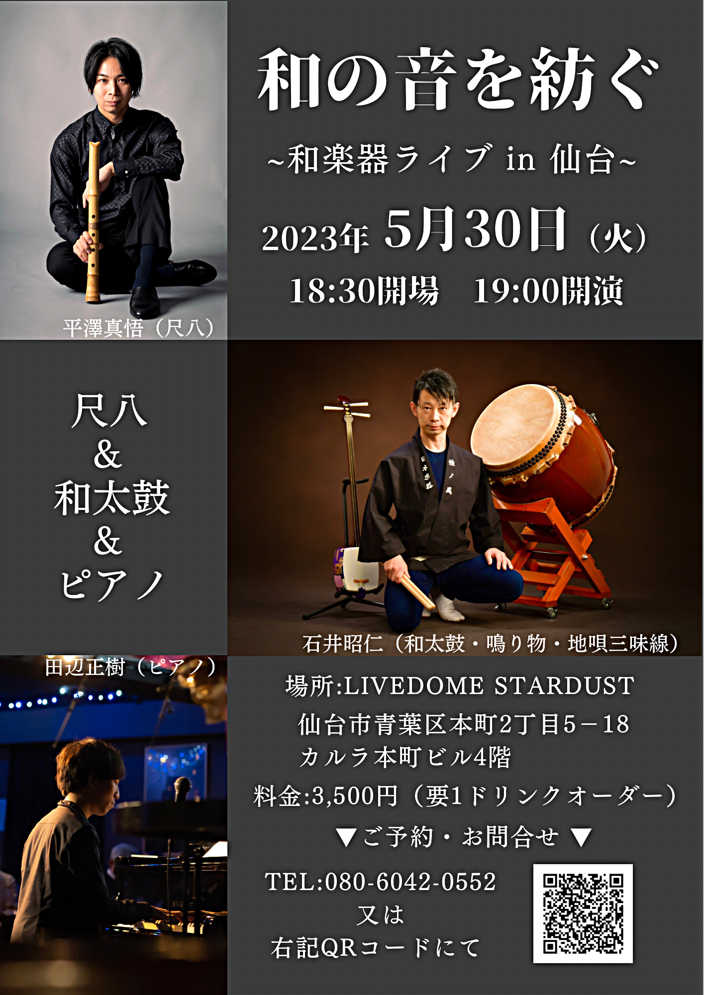 尺八×太鼓×ピアノによるライブです。オリジナルから民謡、ジャズまで幅広い演奏をお届けいたします。